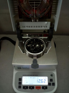 - 測(cè)試種子顆粒1:為了使測(cè)試過(guò)程中種子水分儀將種子烘干烘透,我們將種子分散開來(lái),以便溫度能滲透進(jìn)種子內(nèi)部。取5克種子顆粒撒于不銹鋼托盤中,用鑷子將種子顆粒平鋪均勻,為避免種子烘烤后變焦,我們將溫度設(shè)置在135℃,按“START”鍵開始測(cè)試,18分49秒后檢測(cè)結(jié)束,檢測(cè)數(shù)據(jù)顯示12.61%;