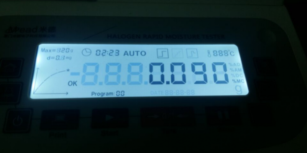 測試樣品1:為了檢測儀器的精確性,待儀器溫度降至30℃(常溫)以下時進行第二次測量,用藥匙取樣10-12g,用藥匙取樣10-12g纖維紙上,溫度設(shè)置85℃用儀器進行加熱,約3分鐘后檢測結(jié)束,檢測數(shù)據(jù)顯示0.090%;