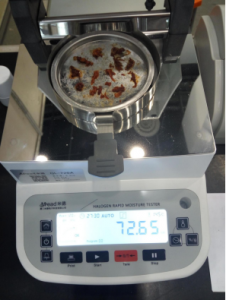用鑷子提取8克豬肉肉末,置于不銹鋼托盤(pán)中,用鑷子將牛肉肉末平鋪均勻,溫度設(shè)置145℃用儀器進(jìn)行加熱,檢測(cè)結(jié)束,檢測(cè)數(shù)據(jù)顯示72.65%;為了檢測(cè)儀器的精確性,待儀器溫度降至50℃以下時(shí)進(jìn)行第二次測(cè)量,用實(shí)驗(yàn)勺提取8克豬肉肉末,置于不銹鋼托盤(pán)中,用實(shí)驗(yàn)勺將面粉平鋪均勻,溫度設(shè)置145℃用儀器進(jìn)行加熱,后檢測(cè)結(jié)束,檢測(cè)數(shù)據(jù)顯示72.90%;?用實(shí)驗(yàn)勺提取8克豬肉肉末,置于不銹鋼托盤(pán)中,用實(shí)驗(yàn)勺將豬肉平鋪均勻,溫度設(shè)置150℃用儀器進(jìn)行加熱后檢測(cè)結(jié)束,檢測(cè)數(shù)據(jù)顯示72.82%。實(shí)驗(yàn)結(jié)果所得數(shù)值較為準(zhǔn)確,儀器檢測(cè)精度較高。