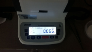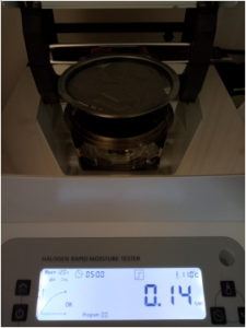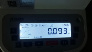 2、為了得到更精確穩(wěn)定的數(shù)據(jù)結(jié)果,在進行第二次測試過程前先等待陶瓷粉末水分儀降溫,待水分儀本身冷卻至40度以下時,這次我們一樣取8克多陶瓷粉末,將陶瓷粉末平鋪均勻,這次我們把溫度依然控制在105℃,這次我們采用自動測試模式。按“START”鍵開始測試,1分41秒后檢測結(jié)束,檢測數(shù)據(jù)顯示0.29%;