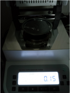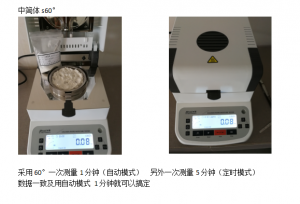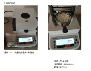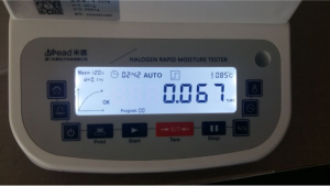 1、測試陶瓷粉末:為了使測試過程中將陶瓷粉末烘干烘透,我們將陶瓷粉末分散開來,以便溫度能滲透進陶瓷粉末內(nèi)部。取8克多陶瓷粉末撒于不銹鋼托盤中,用鑷子將陶瓷粉末平鋪均勻,為使陶瓷粉末經(jīng)過高溫度加熱后能夠徹底烘干,我們將溫度設置在105℃,按“START”鍵開始測試,1分鐘37秒后檢測結(jié)束,檢測數(shù)據(jù)顯示0.30%;