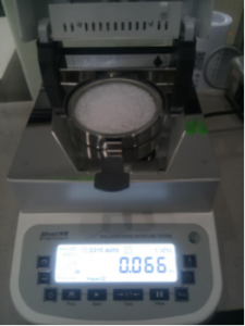 用一定量塑料顆粒,置于不銹鋼托盤中,用鑷子將塑料顆粒平鋪均勻,溫度設(shè)置105℃用儀器進行加熱,10分鐘后檢測結(jié)束,檢測數(shù)據(jù)顯示0.045%;為了檢測儀器的精確性,待儀器溫度降至50℃以下時進行第二次測量,用實驗勺提取8克塑料顆粒,置于不銹鋼托盤中,用實驗勺將塑料顆粒平鋪均勻,溫度設(shè)置105℃用儀器進行加熱,10分鐘后檢測結(jié)束,檢測數(shù)據(jù)顯示0.057%;?用實驗勺提取8克塑料顆粒,置于不銹鋼托盤中,用實驗勺將塑料顆粒平鋪均勻,溫度設(shè)置105℃用儀器進行加熱,10分鐘后檢測結(jié)束,檢測數(shù)據(jù)顯示0.053%。實驗結(jié)果所得數(shù)值較為準確,儀器檢測精度較高。